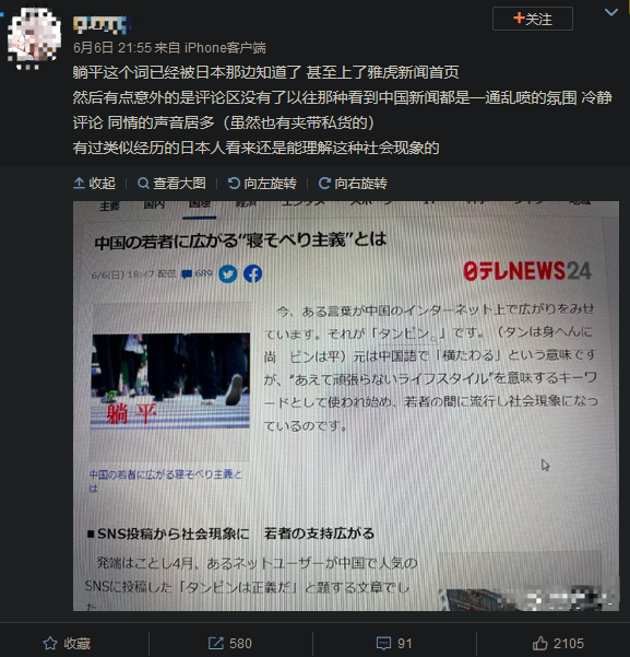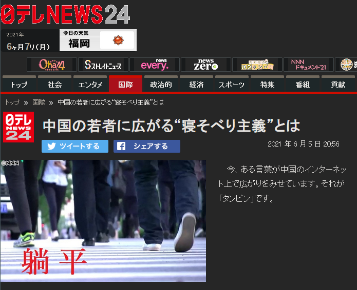 日本新闻网站News24于6月5日发表文章,报道了最近国内很火的热词“躺平”。相信大多数人都对这个词非常熟悉。文章介绍了躺平一词爆火的起源,同时也讲述了国内社会对于年轻人如今这种态度的各方社论。文中提到:“近年来,由于城市地区就业难、物价飞涨等问题,中国年轻人所处的社会环境日趋严峻。”
