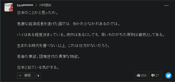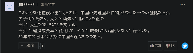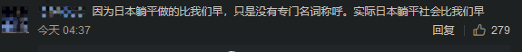 对此有网友回复说:“因为日本躺平做的比我们早,只是没有专门名词称呼。”