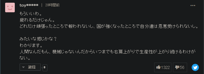 另一位网友说到:“我是人,我不是机器,所以我无法不断提高自己的生产力。”