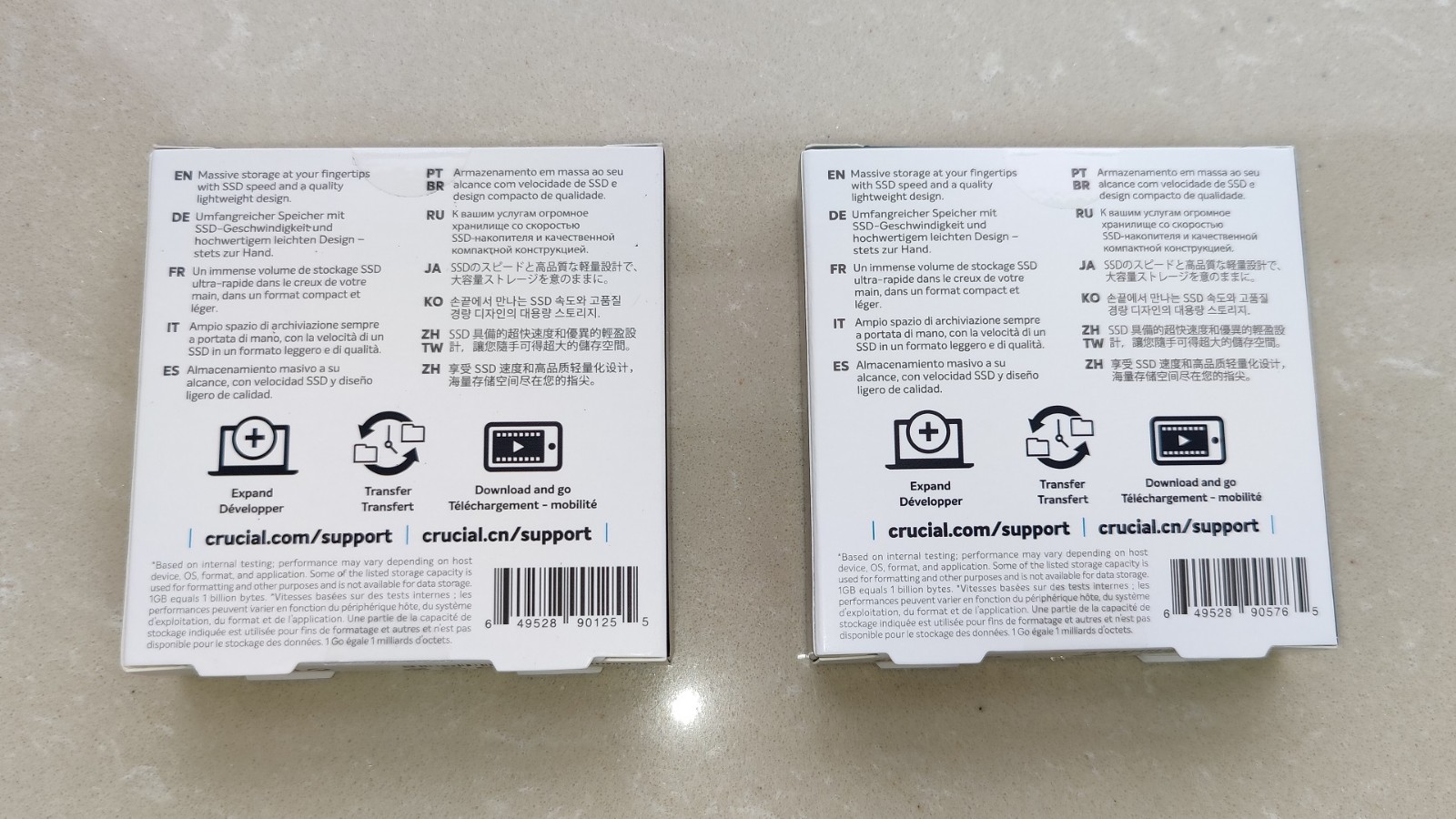 包装盒背面是多语言说明,区别仅在于条码型号。兼容性方面,Crucial英睿达 X6 系列移动硬盘支持跨 Windows、macOS 和 Android 移动操作系统的高速数据传输体验。