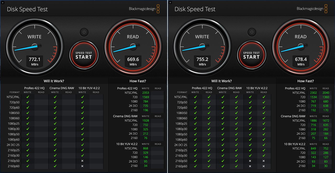 长效稳定数值,BlackMagic Disk Speed Test 的顺序读写,分别在 760 MB/s 和 670 MB/s 以上。