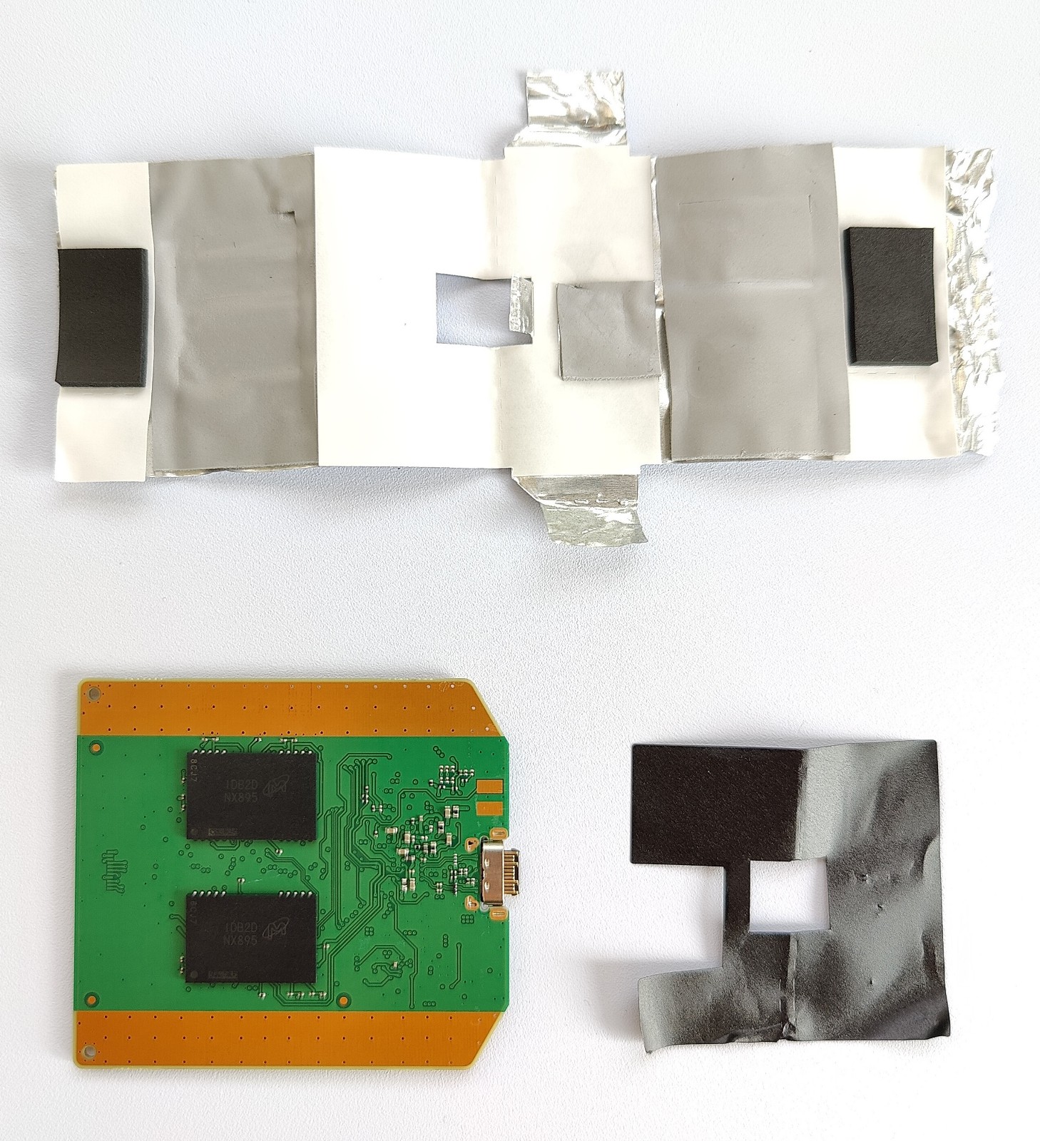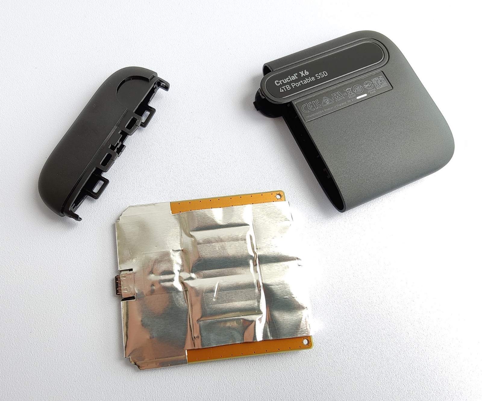 小心揭开屏蔽导热贴和绝缘胶布后,可知Crucial英睿达 4TB 版 X6 移动固态硬盘使用了一体式 PCB 设计,而不像 2TB 版本那样使用了基于慧荣 SM2259XT 主控的 SATA 转接方案。