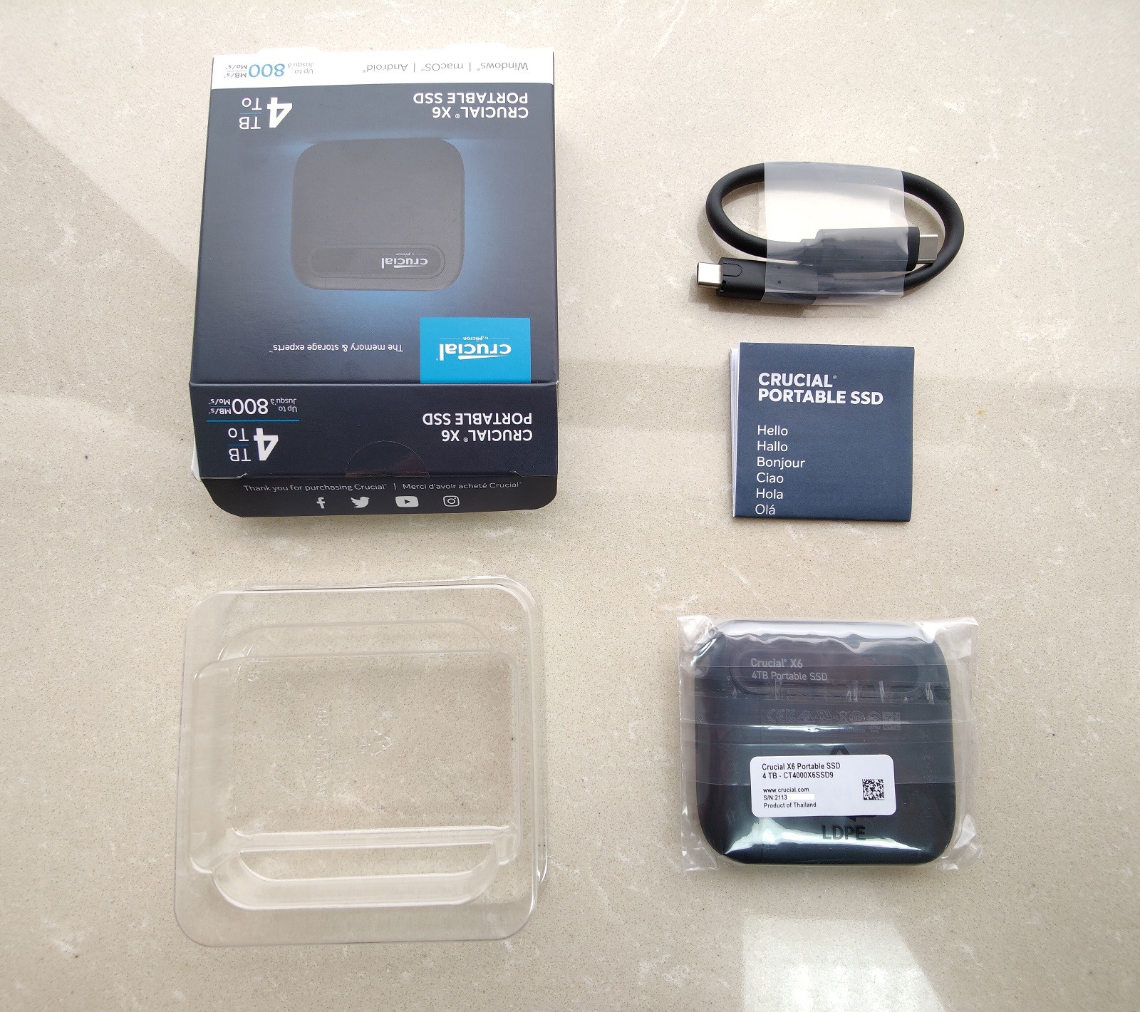 里面为 CT4000X6SSD9 移动固态硬盘本体、双头 USB-C 数据线、以及一张多语言简易使用说明。