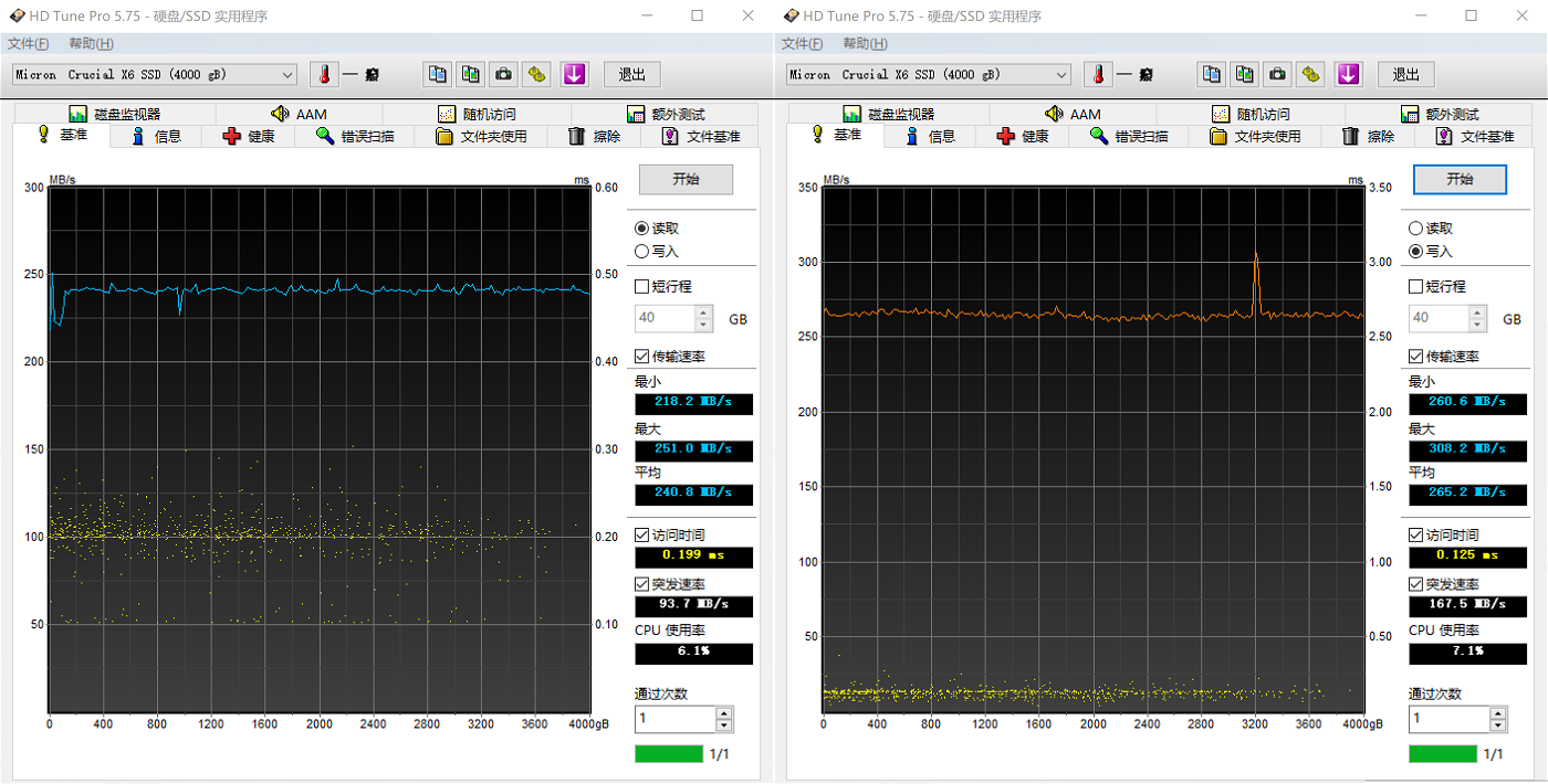 HD Tune Pro 5.75 - 全盘读取最大 251 MB/s,平均 240 MB/s;全盘写入最大 308 MB/s,平均 265 MB/s 。
