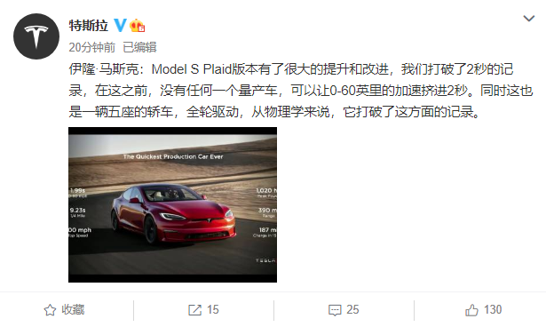 有趣的是,特斯拉官微发布了马斯克所说的一段话。其表示,Model S Plaid版本有了很大的提升和改进,我们打破了2秒的记录,在这之前,没有任何一个量产车,可以让0-60英里的加速挤进2秒。同时这也是一辆五座的轿车,全轮驱动,从物理学来说,它打破了这方面的记录。