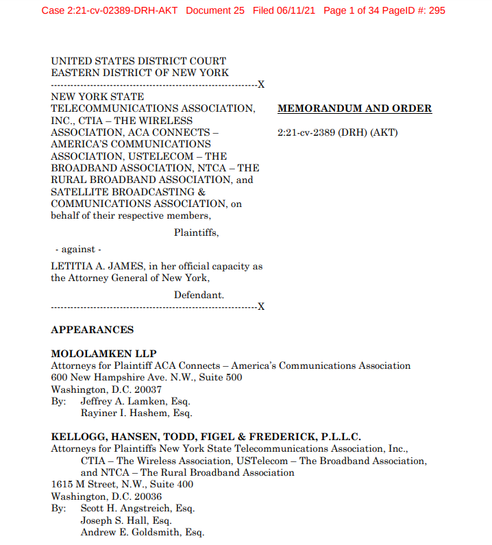 Hurley写道:“从2021年6月15日开始,原告将遭受无法挽回的损失,随着时间的推移,原告的损失会越来越大,而且这件事的艰巨性,六个原告与多个成员组织一起攻击影响三分之一的纽约家庭的法规,这就需要进行漫长的诉讼。”对纽约的诉讼是由纽约州电信协会、USTelecom、CTIA-无线协会、NTCA-农村宽带协会、卫星广播和通信协会以及美国通信协会提起的。