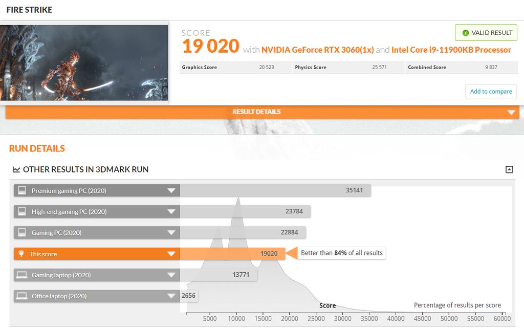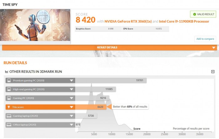 性能是在 3DMark Time Spy 和 3DMark Firestrike 基准中测量的。在Time Spy中,个人电脑的得分是 8420(整体)、8098(图形)和10872(CPU)分,而在3DMark Firestrike测试中,个人电脑的得分是19020(整体)、20523(图形)和25571(CPU)分。