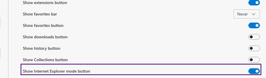 访问设置>外观,并启用 "显示Internet Explorer模式按钮"。