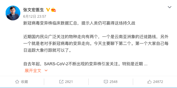 复旦大学附属华山医院感染科主任、上海市新冠肺炎医疗救治专家组组长、国家传染病医学中心主任张文宏6月12日深夜发表微博称,新冠病毒变异确实越来越快了,近期国际上发表的一系列学术论文针对新冠病毒变异株提供了非常可观的临床数据,疫苗对变异株的保护性逐渐明确。