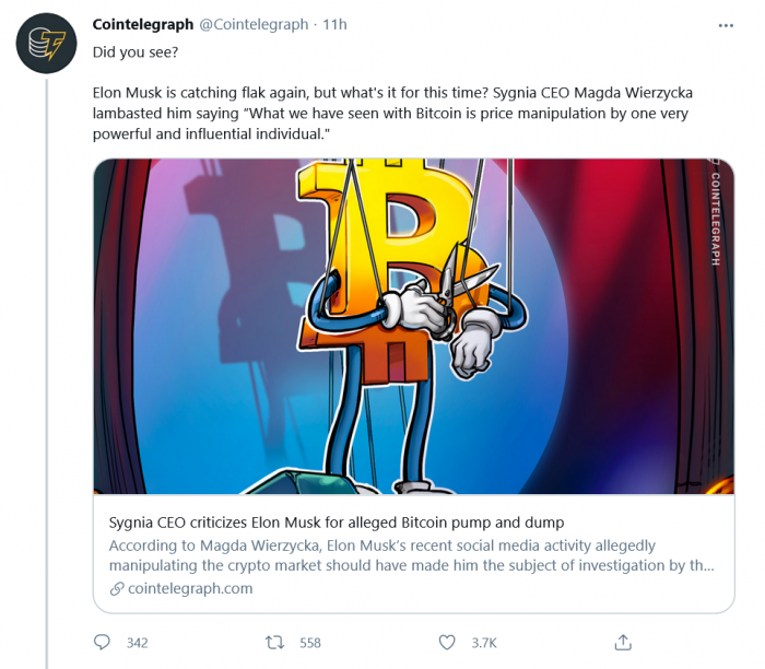上述是马斯克对南非资产管理公司Sygnia首席执行官Magda Wierzycka发表的评论做出反应,后者表示马斯克关于比特币价格的推文是“市场操纵”,应该引发美国证券交易委员会的调查。