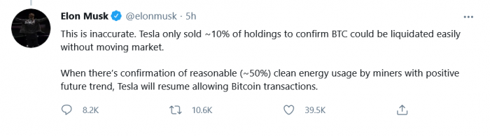 特斯拉首席执行官埃隆马斯克周日表示,一旦确认矿工合理使用清洁能源,公司将恢复比特币交易。“当确认未来趋势积极的矿工合理(约50%)使用清洁能源时,特斯拉将恢复允许比特币交易。”