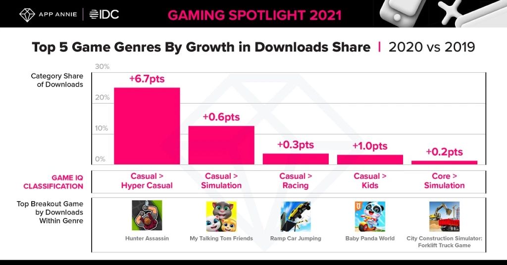 但是,人们对超休闲和模拟游戏的胃口大增。按下载量计算,市场份额增长最大的子类型是超休闲(+6.7个百分点),儿童(+1.0个百分点),模拟(+0.6个百分点)和赛车(+0.3个百分点)。