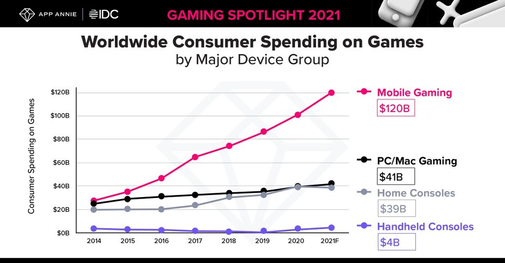 这些数字巩固了我们对移动游戏的了解。它们是现在游戏中最大的类别。报告称,移动端的支出将扩大其领先优势,超过桌面游戏的 2.9 倍,是家用游戏机的 3.1 倍。新冠疫情一年后,对移动游戏的需求继续增加。