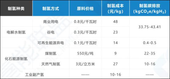 不同制法氢的成本以及产生的碳排放 数据来源:中国氢能联盟