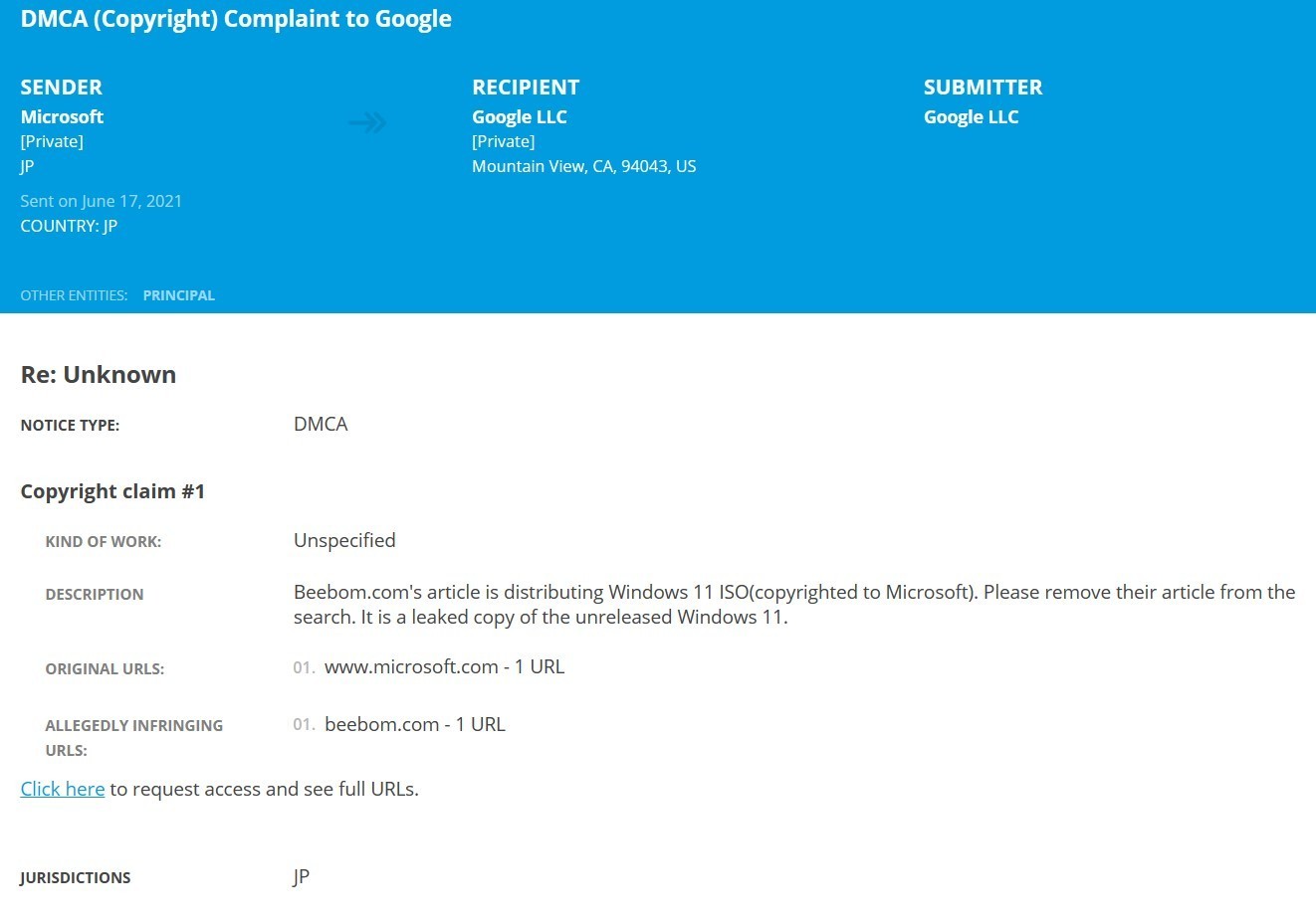 目前尚不清楚其它直接分发 Windows 11 泄露 ISO 的站点是否也收到了 DMCA 侵权删除通知,但只要微软下狠心,更多事情仍可能发生。