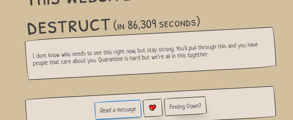 该网站于2020年4月推出,仅在疫情宣布数周后上线。该网站的恰当名称叫The Website Will Self-Destruct(本网站将自动销毁)。许多地方正在经历全面封锁、公众承受着不知道这种情况会持续多久的压力,另外有关抑郁和孤独的报告正在迅速攀升。