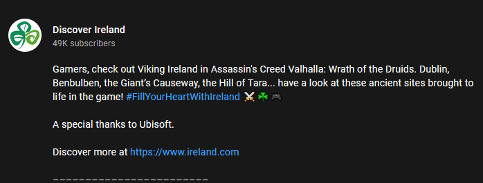 爱尔兰旅游局在视频的描述中写道:“玩家们,快来看看《刺客信条:英灵殿》“德鲁伊之怒”中的维京爱尔兰。都柏林、布尔本、巨人堤道、塔拉山……看看这些在游戏中栩栩如生的古代遗址!”