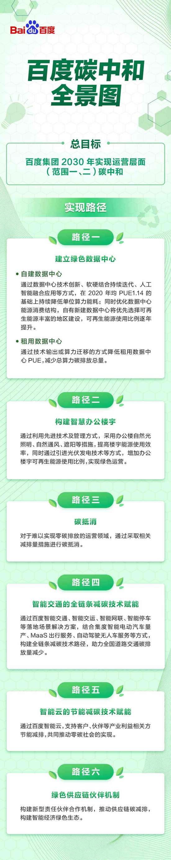 6月22日下午消息,百度今日公布在2030年实现集团运营层面的碳中和目标。百度将以2020年为基准年,计划在已有绿色实践的基础上,参照《温室气体核算体系》范围一、二类型,在数据中心、办公楼宇、碳抵消、智能交通、智能云、供应链六个方面,全面构建2030年碳中和目标的科学实现路径。