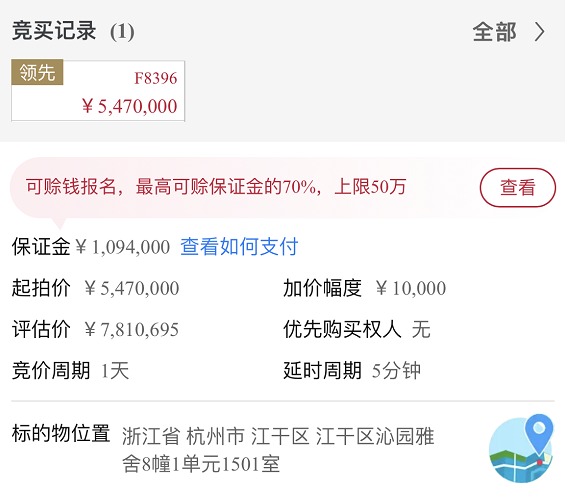 比如这个杭州的沁园雅舍,评估价是 781 万元,起拍价一般是评估价的七折,也就是 547 万元。