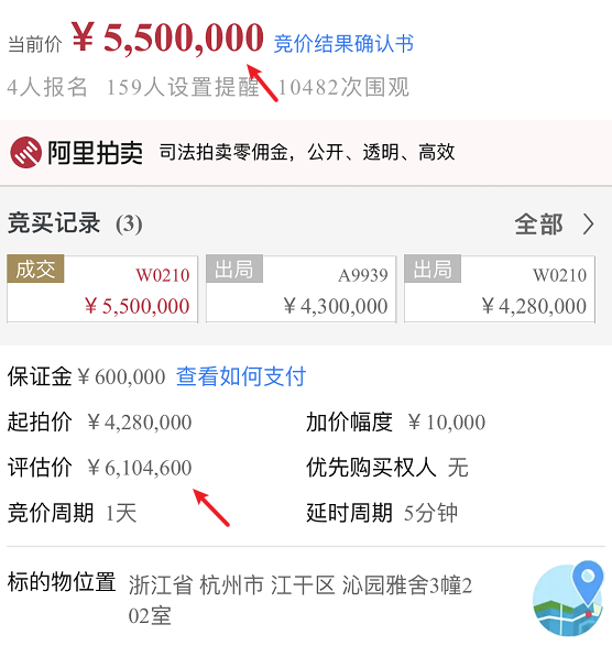也就是说,如果上面那位竞价者以起拍价拍到了这个房子,扣去契税之类的,也能赚个 300 万。