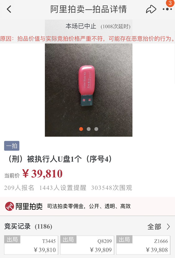 我听说今天这个事儿又有了后续:有个他用过的 U 盘居然也被拍到了三万九千多,最后也被中止拍卖了。
