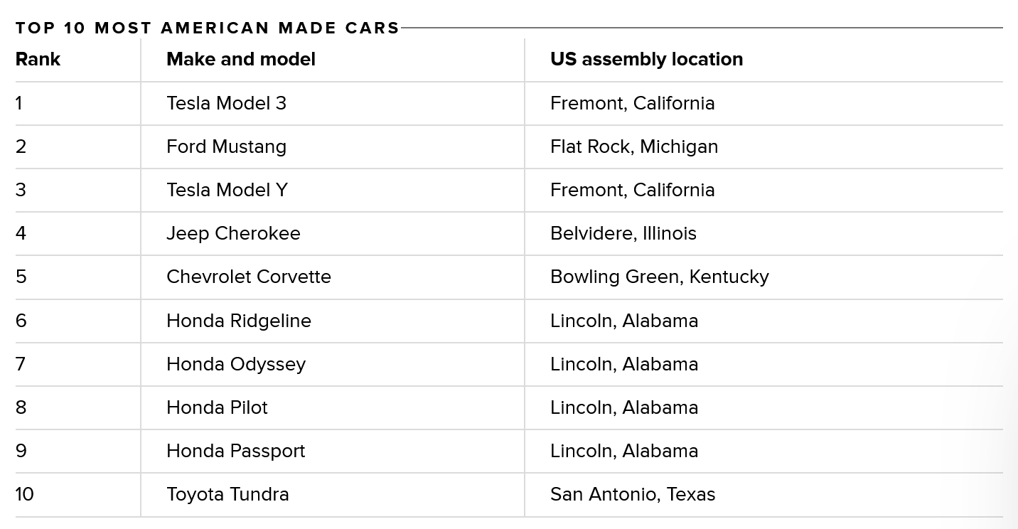该指数使用5个标准来选择车型并对其进行排名,分别是:装配地点、根据《美国汽车标牌法》(American Automobile Labeling Act)确定的零部件采购、与车辆生产相关的美国工厂就业、发动机采购和变速器采购。