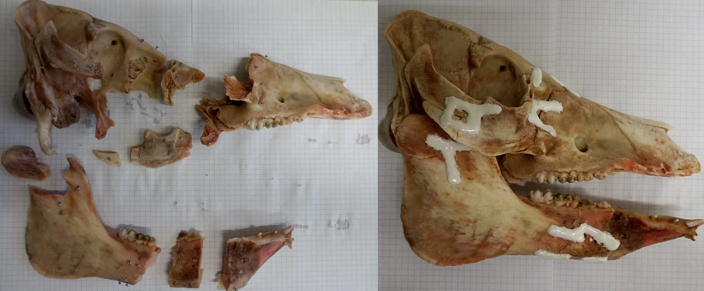 该贴片由医学上认可的聚对苯二甲酸乙二醇酯(PET)纤维网和腻子状聚合物/羟基磷灰石复合材料交替组成。一旦它被塑造成所需的形状和大小,它就被暴露在高能LED可见光源下,使其在几秒钟内变硬。然后,它将永久地保持在原位,达到与金属板相同的目的--但据说没有缺点。