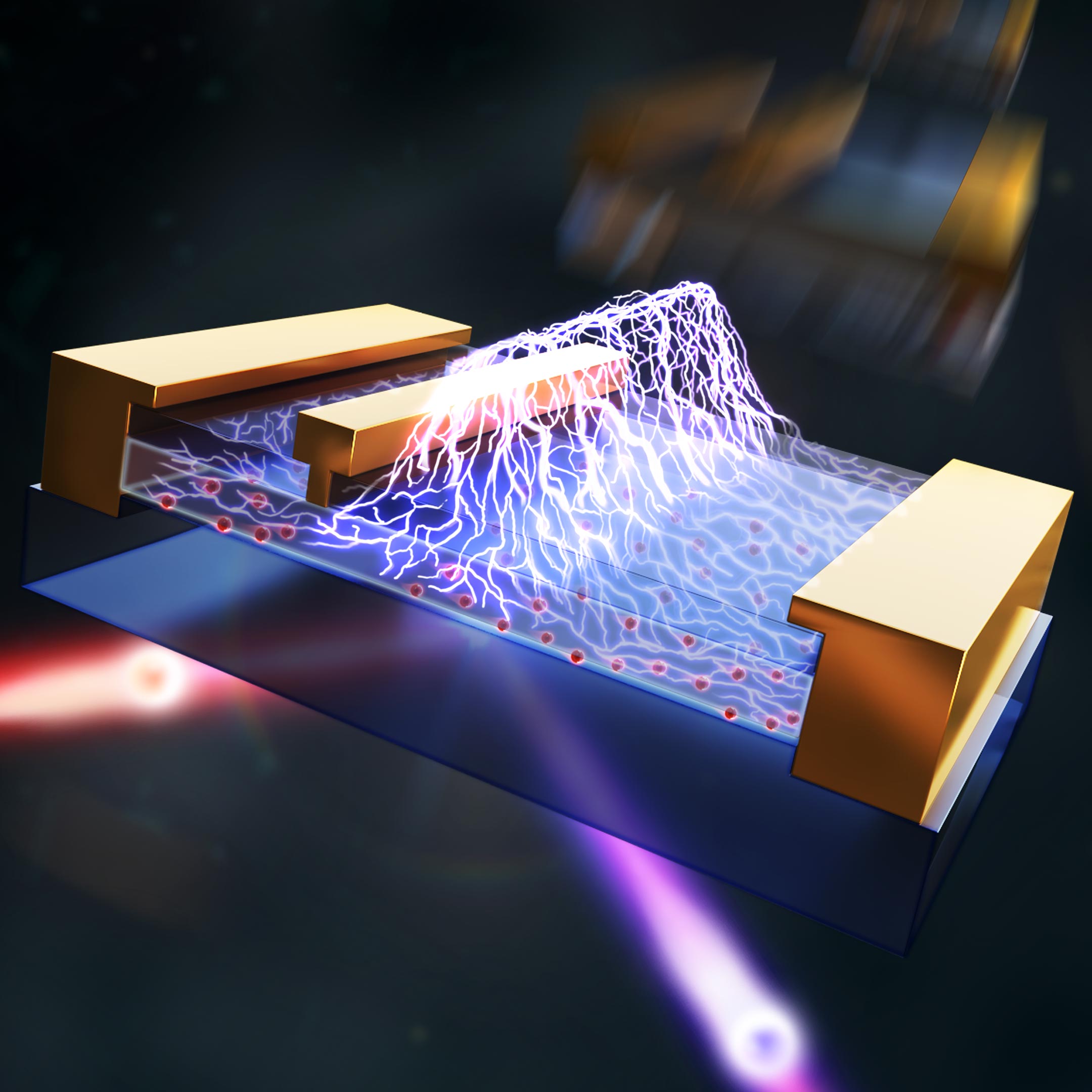 半导体器件中的量化电场,上图展示了氮化镓晶体管沟道中的电场分布,激光束则凸显了这项技术的二次谐波生成(SHG)特性。(图自:Yuke Cao)