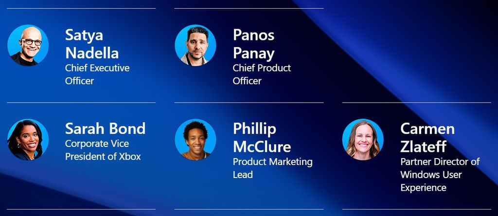 今天Windows发布会的演讲者名单包括CEO萨提亚·纳德拉、首席产品官Panos Panay、Xbox全球联合副总裁Sarah Bond、产品市场主管Phillip McClure、Windows用户体验合伙主管Carmen Zlateff。预估本次发布会进行 45 分钟左右时间。