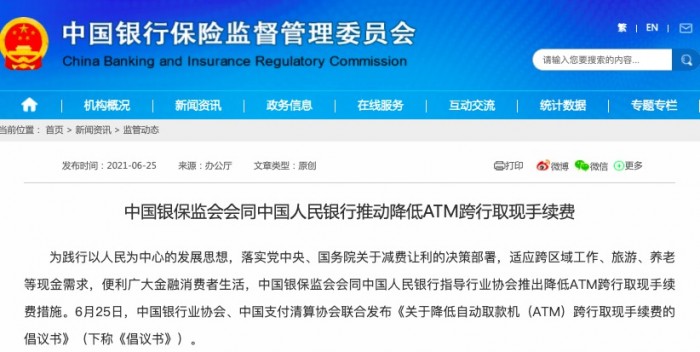为践行以人民为中心的发展思想,落实党中央、国务院关于减费让利的决策部署,适应跨区域工作、旅游、养老、应急等现金需求,便利广大金融消费者生活,在中国银保监会、中国人民银行的指导下,中国银行业协会、中国支付清算协会推出降低ATM跨行取现手续费措施。