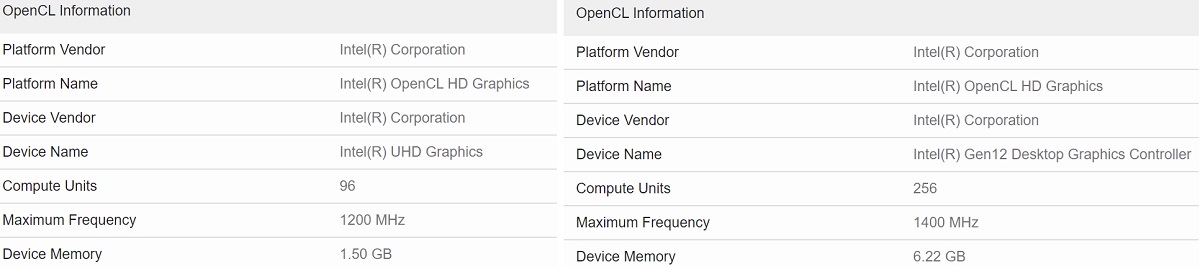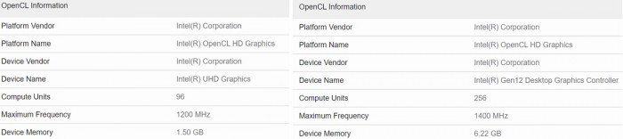 根据数据现实,Xe-HPG 96EU的最高频率为1.2 GHz,Xe-HPG 256EU则为1.4 GHz,不过参数显示仍然有点问题,比如显存就可能受到基准测试类型影响,分别显示为1.5GB和6.22GB,后者甚至被识别为“第12代桌面图形控制器”。参加测试的Alder Lake处理器的参数显示大概受到大小核的影响,基本频率为797 MHz,睿频为3989 MHz,显示为FCBGA 1744插座基本确定应该是笔记本电脑。