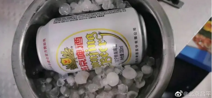 此外,为了体现冰雹量,还有网友直接用冰雹镇起了啤酒。