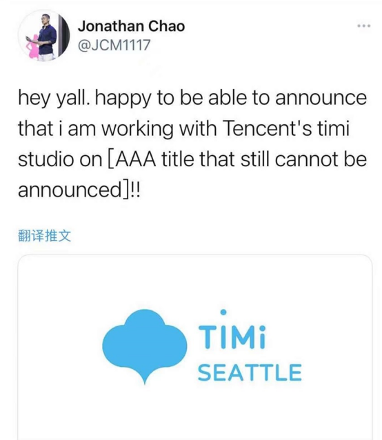 之后没多久,他名字前的Riot被拿掉,同时也发了另外一条推文。在推文中,他明显很高兴,用Hey yall开头,并表示很高兴可以宣布,自己正在腾讯天美工作室的一项还不能公开的3A级项目工作。并且配了个天美西雅图工作室的LOGO。原截图见前文图一。而这位JonathanChao的中文可不是一般的好,很多人猜测其姓Chao应该是华人华侨。