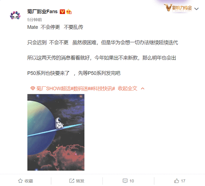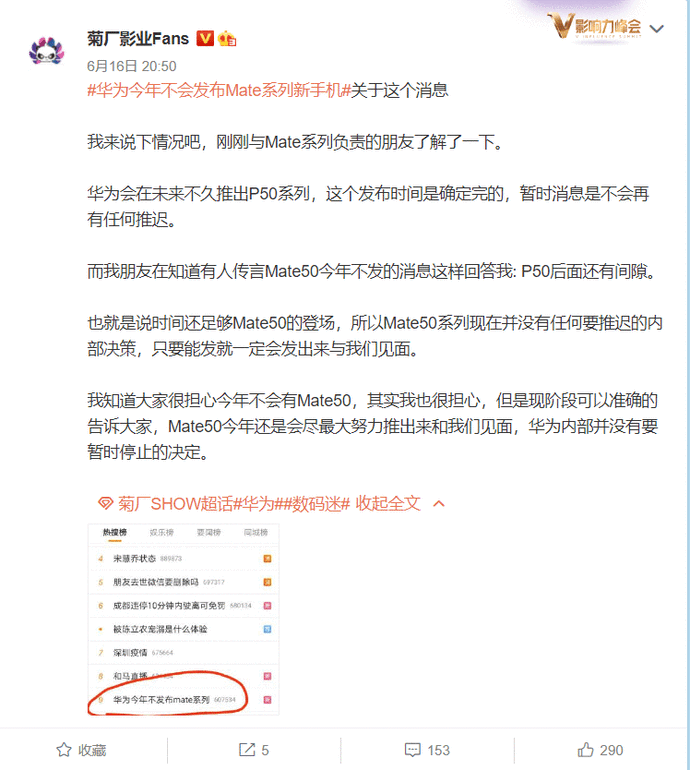 其实对于近几天网间传闻的华为将停更Mate50系列的消息,@菊厂影业Fans 之前就已经出面辟谣了,其曾表示,“#华为今年不会发布Mate系列新手机#关于这个消息 我来说下情况吧,刚刚与Mate系列负责的朋友了解了一下。华为会在未来不久推出P50系列,这个发布时间是确定完的,暂时消息是不会再有任何推迟。而我朋友在知道有人传言Mate50今年不发的消息这样回答我: P50后面还有间隙。也就是说时间还足够Mate50的登场,所以Mate50系列现在并没有任何要推迟的内部决策,只要能发就一定会发出来与我们见面。我知道大家很担心今年不会有Mate50,其实我也很担心,但是现阶段可以准确地告诉大家,Mate50今年还是会尽最大努力推出来和我们见面,华为内部并没有要暂时停止的决定。”