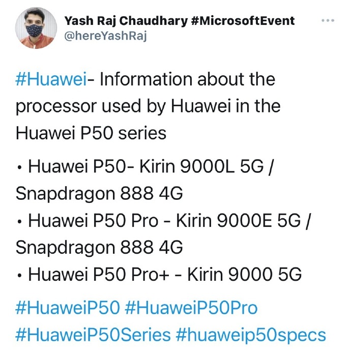 6月24日消息,Twitter用户@hereYashRaj在社交媒体爆料称,即将发布的华为P50和P50 Pro的4G版将采用骁龙888处理器,5G用麒麟9000L/E。只有P50Pro+才是麒麟9000满血+5G。此前有博主爆料称华为P50正式发布日期为7月29日,具体信息如下。