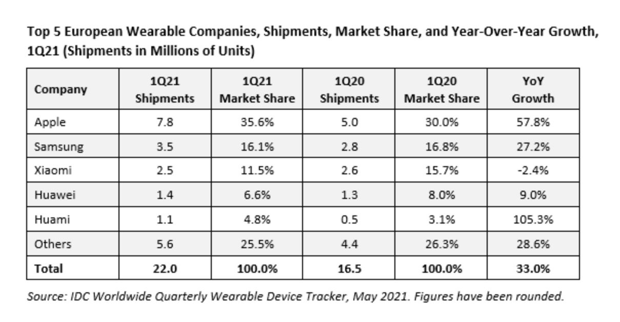 苹果引领多国可穿戴设备市场,显然要归功于Apple Watch的强劲销售。IDC提供的新统计数据显示,苹果在欧洲也毫无疑问是王者,该公司在2021年第一季度的相关可穿戴设备设备销量不少于780万台。