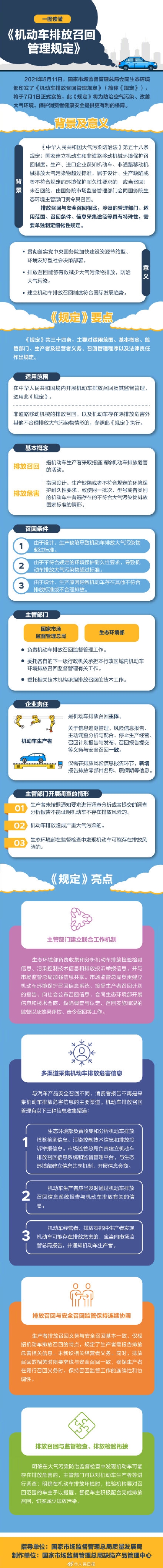 《机动车排放召回管理规定》于7月1日起实施,我国汽车召回的范畴将由安全召回扩展至排放召回。5月20日,市场监管总局联合生态环境部制定并发布《机动车排放召回管理规定》,将产品召回由安全召回扩展至排放召回。自2021年7月1日起施行。
