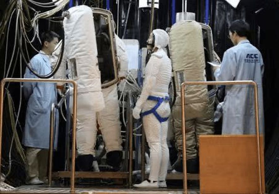 身穿液冷服的中国航天员准备进入低压舱进行训练。