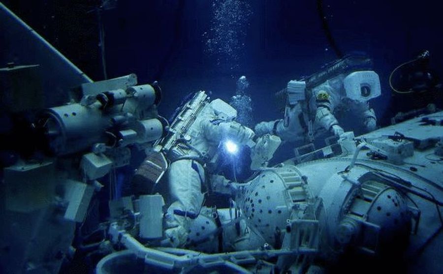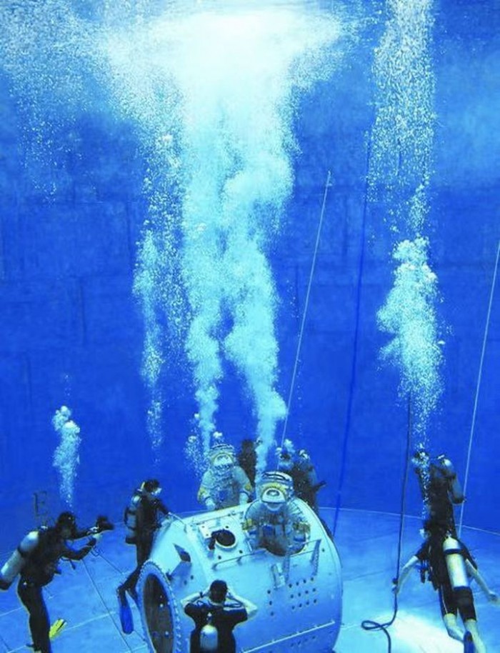 中国航天员着舱外航天服在模拟失重的中性浮力水槽中进行出舱活动任务训练。