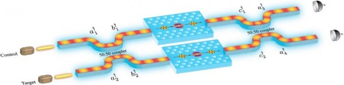 当一个光子进入一个逻辑门时,没有什么值得注意的事情发生--它进去了又出来了。但是当有两个光子时,"这时我们预测这两个光子可以形成一种新的状态,即光子二聚体。事实证明,这种新状态是至关重要的。"当两个独立的光子(代表两个光学量子比特)进入逻辑门时,"逻辑门的设计使两个光子可以形成一个光子二聚体,"Shen 说。"事实证明,新的量子光子状态是至关重要的,因为它使输出状态具有正确的符号,这对光逻辑操作至关重要。"
