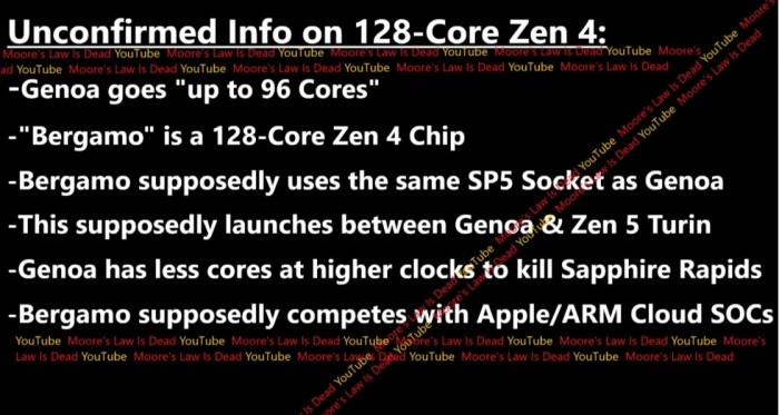 根据权威曝料专家Moore's Law is Dead的最新说法,AMD Zen4家族的霄龙将有两个分支,一是官方早已公布的Genoa(热那亚),可以视为标准版,最多增加到96核心192线程,继续和Intel正常竞争,对标计划明年发布的Sapphire Rapids四代可扩展至强。