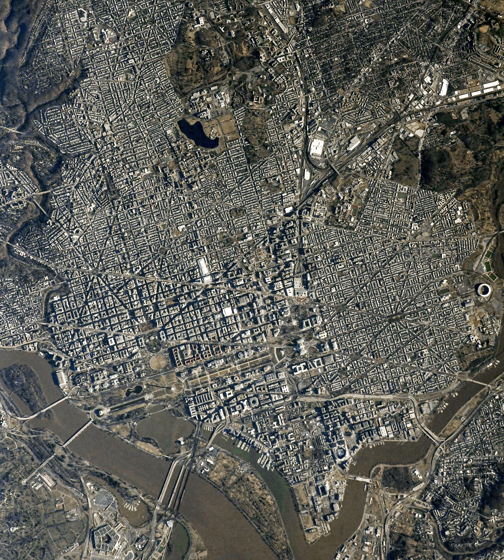 宽阔的对角线大道从华盛顿特区的国会大厦向外辐射,贯穿整个城市。在这张由国际空间站上的宇航员拍摄的春季照片中,华盛顿特区的原始布局和设计一目了然。这张高分辨率照片提供了美国首都城市布局的视图,其建筑师Peter L'Enfant和Andrew Ellicott在1790年代起草哥伦比亚特区的计划时就想到了这一点,这座著名的城市坐落在波托马克河和阿纳科斯蒂亚河的交汇处。