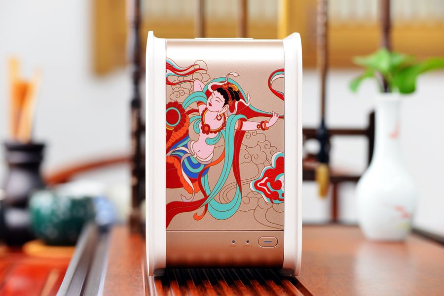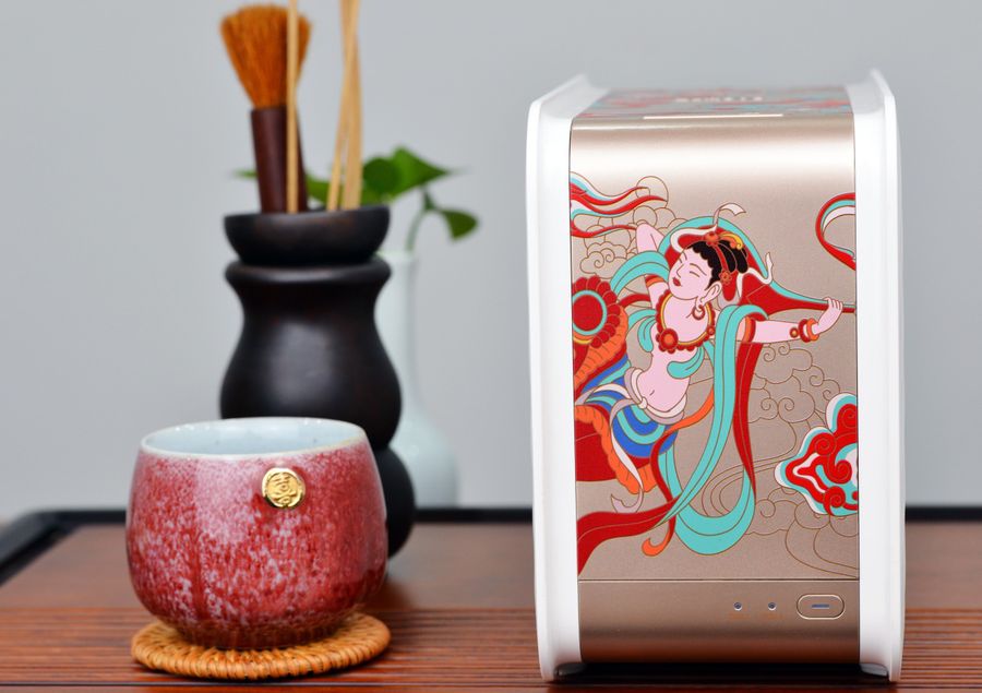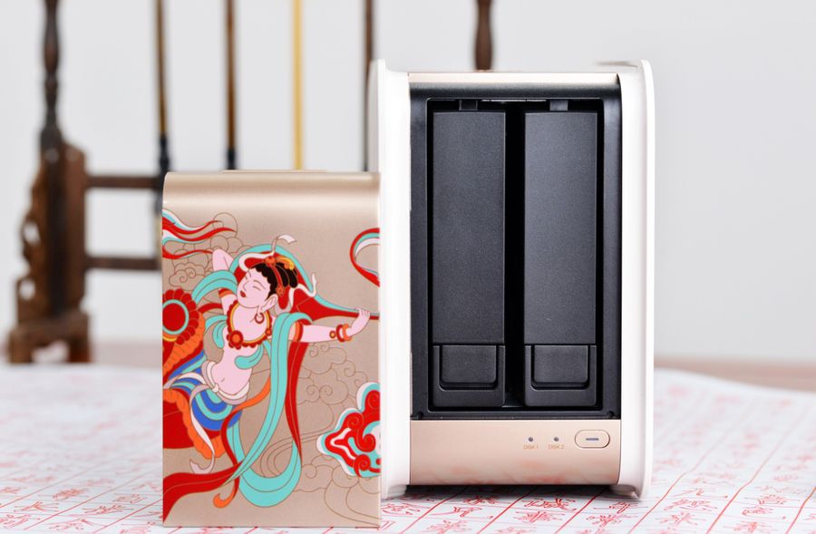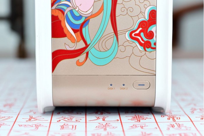 T2造型简约,配色优雅大气,摒弃了传统NAS常见的黑、粗、大形象,另外还结合了反弹琵琶图案以及大胆的色彩,摆放在桌面上就如同一件艺术品、一件瓷器,显得很精致。