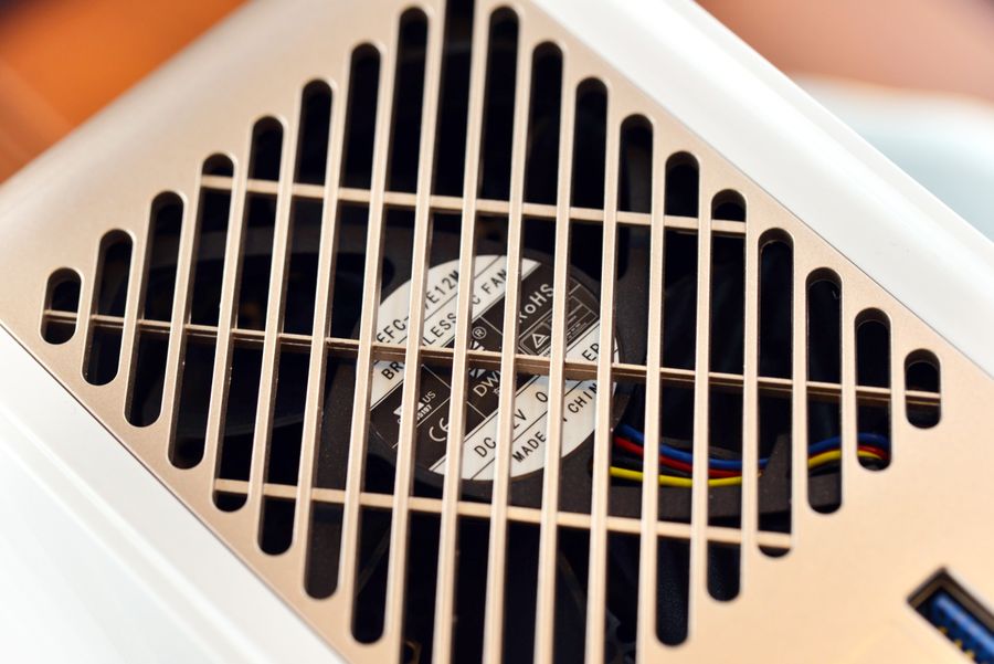 在T2的背部可以看到92mm静音散热风扇,在机身底部同样也设计有散热格栅。据官方数据,它在满负荷工作时噪声仅有26.7dB,不会让思绪因为嗡嗡嗡的低沉噪声而纷乱。