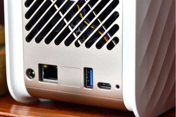 T2的接口集成在机身背面。一个DC电源接口、1个千兆RJ45有线网接口、1个USB 3.0 接口与1个USB 3.0 Type-C接口。此外,还有一个RESET键孔可以用来重置设备。