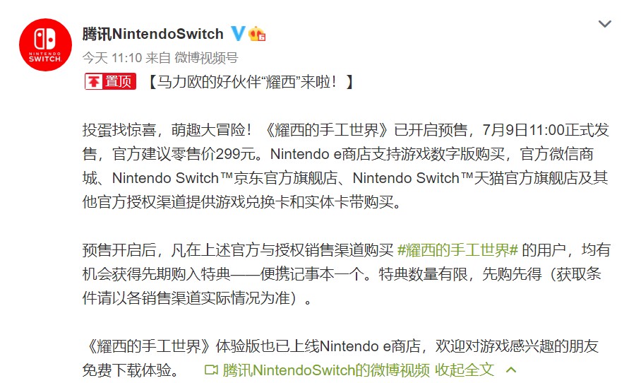 今日(7月5日),据@腾讯NintendoSwitch官方微博公布的消息,Switch国行版《耀西的手工世界》已于今日上午11:00开启预售,同时支持Amiibo,售价299元,7月9日11:00正式发售。