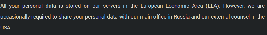 “您的所有个人数据都储存在我们位于欧洲经济区的服务器商。但是我们有时需要与位于俄罗斯的主办公室以及美国的外部法律顾问共享您的个人数据。”