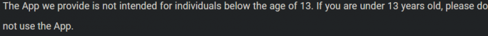 隐私政策页面上还包括一个毫无意义的警告,防止13岁以下的儿童使用该程序。这违反了软件所使用的GPL许可证,该许可证禁止对软件使用做出任何限制。