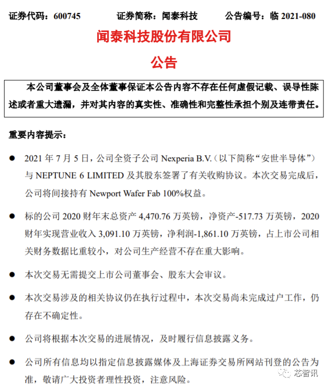 7月5日晚间,闻泰科技发布公告,宣布旗下全资子公司安世半导体(Nexperia B.V.)已与英国最大的芯片制造商Newport Wafer Fab母公司NEPTUNE 6 LIMITED(以下简称“NEPTUNE 6”)及其股东签署了有关收购协议。