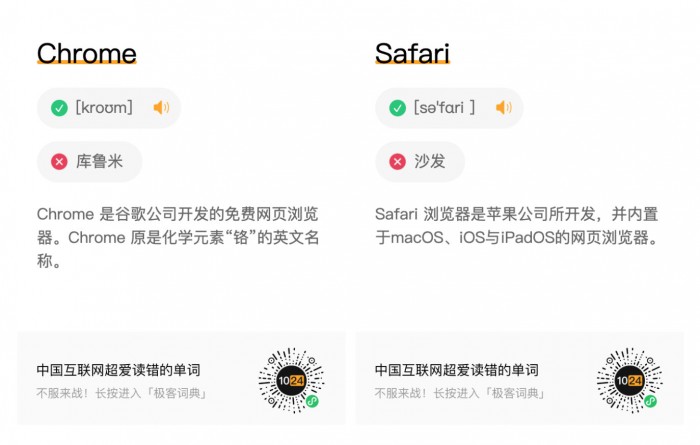 不知道你有没有遇到以上情况,由于音标误读、缩写误读、外来语言等原因的以讹传讹,导致互联网环境中许多英文单词的读音都是错的。在某些沟通过程中,甚至需要通过拼写来了解对方的意思。 为了解决这一问题,我们整理了一系列互联网超爱读错的单词,做了一个小程序“极客词典”,其中包含开发、设计、产品、品牌等4个方向。